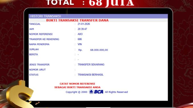 NAGA303 mengucapkan selamat kepada user id : VIN*** yang telah berhasil mendapatkan jackpot pada permainan LIVE CASINO DI DUEL DICE. Kemenangan sebesar Rp 68.000.000,-. telah dibayarkan LUNAS oleh pihak naga303 kepada pemilik user id setelah yang bersangkutan mengisi formulir withdraw. Proses pencairan dana berlangsung sangat cepat hanya dalam waktu 6-11 menit sudah berada dalam rekening pemilik user id. Bukti transfer yang dapat anda lihat adalah bukti SAH / VALID yang langsung di dapatkan melalui bukti transaksi dari Bank yang digunakan untuk pengiriman dana pada rekening pemilik user id. Terima kasih kami sampaikan kepada para pengguna setia naga303 yang telah menggunakan situs kami, sebagai Bandar Terpercaya yang pastinya membayar semua kemenangan member hingga lunas. Apakah Naga303 PENIPU ? Reputasi “NAGA303 TERPERCAYA” sudah sangat melekat. puluhan hingga ratusan ribu pengguna setia NAGA303 tetap menggunakan situs terbesar dan terbaik di Indonesia ini. Hapus rasa was-was dan khawatir anda, kemenangan anda berapapun PASTI dibayarkan hingga lunas.