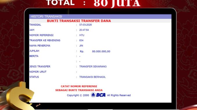 NAGA303 mengucapkan selamat kepada user id : DAF*** yang telah berhasil mendapatkan jackpot pada permainan LIVE CASINO DI BACCARAT . Kemenangan sebesar Rp 80.000.000,-. telah dibayarkan LUNAS oleh pihak naga303 kepada pemilik user id setelah yang bersangkutan mengisi formulir withdraw. Proses pencairan dana berlangsung sangat cepat hanya dalam waktu 6-11 menit sudah berada dalam rekening pemilik user id. Bukti transfer yang dapat anda lihat adalah bukti SAH / VALID yang langsung di dapatkan melalui bukti transaksi dari Bank yang digunakan untuk pengiriman dana pada rekening pemilik user id. Terima kasih kami sampaikan kepada para pengguna setia naga303 yang telah menggunakan situs kami, sebagai Bandar Terpercaya yang pastinya membayar semua kemenangan member hingga lunas. Apakah Naga303 PENIPU ? Reputasi “NAGA303 TERPERCAYA” sudah sangat melekat. puluhan hingga ratusan ribu pengguna setia NAGA303 tetap menggunakan situs terbesar dan terbaik di Indonesia ini. Hapus rasa was-was dan khawatir anda, kemenangan anda berapapun PASTI dibayarkan hingga lunas.