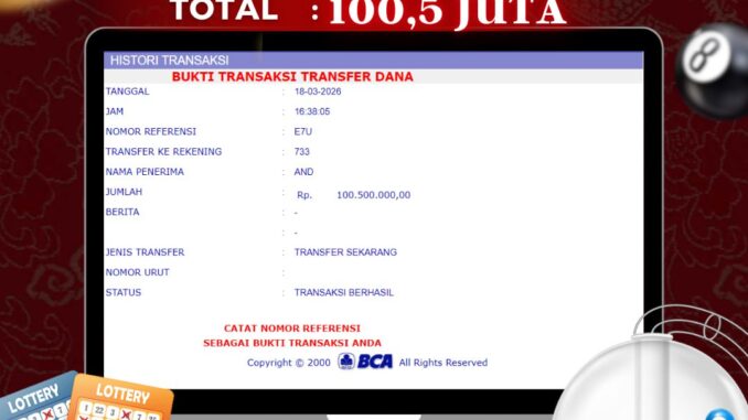 NAGA303 mengucapkan selamat kepada user id : GEL*** yang telah berhasil mendapatkan jackpot pada permainan TOGEL di SHIO AYAM. Kemenangan sebesar Rp 100.500.000,-. telah dibayarkan LUNAS oleh pihak naga303 kepada pemilik user id setelah yang bersangkutan mengisi formulir withdraw. Proses pencairan dana berlangsung sangat cepat hanya dalam waktu 6-11 menit sudah berada dalam rekening pemilik user id. Bukti transfer yang dapat anda lihat adalah bukti SAH / VALID yang langsung di dapatkan melalui bukti transaksi dari Bank yang digunakan untuk pengiriman dana pada rekening pemilik user id. Terima kasih kami sampaikan kepada para pengguna setia naga303 yang telah menggunakan situs kami, sebagai Bandar Terpercaya yang pastinya membayar semua kemenangan member hingga lunas. Apakah Naga303 PENIPU ? Reputasi “NAGA303 TERPERCAYA” sudah sangat melekat. puluhan hingga ratusan ribu pengguna setia NAGA303 tetap menggunakan situs terbesar dan terbaik di Indonesia ini. Hapus rasa was-was dan khawatir anda, kemenangan anda berapapun PASTI dibayarkan hingga lunas.